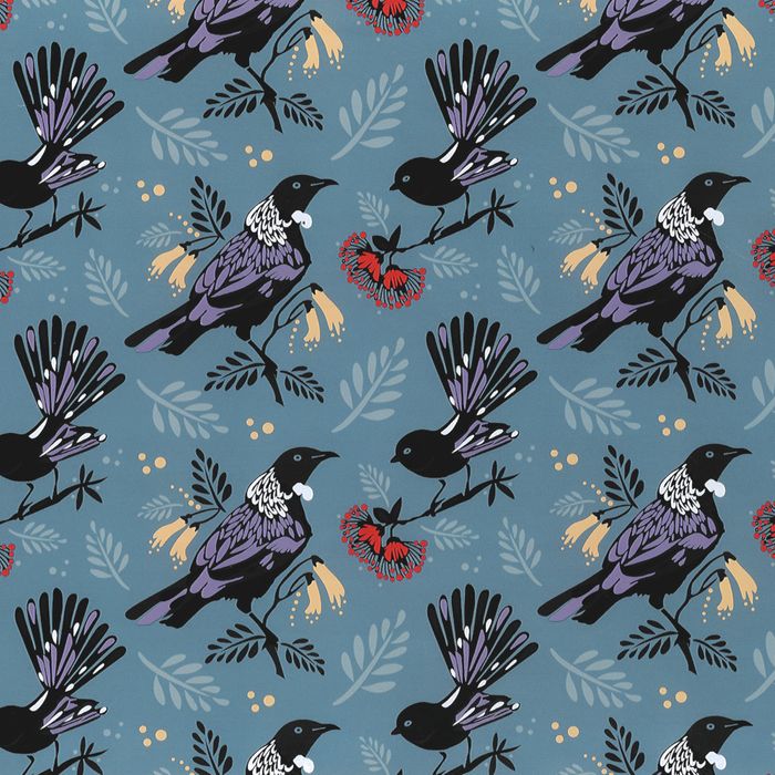 NZ designed paper off Tui and Fantails on branches of Kowhai and Pohutakawa flowers with a delicate sketch of fern. Now available in new shade- steel blue!