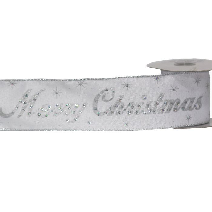 White linen silver edged wired ribbon. Merry Christmas script in faint silver adorned with glittering jewels. NO RETURNS