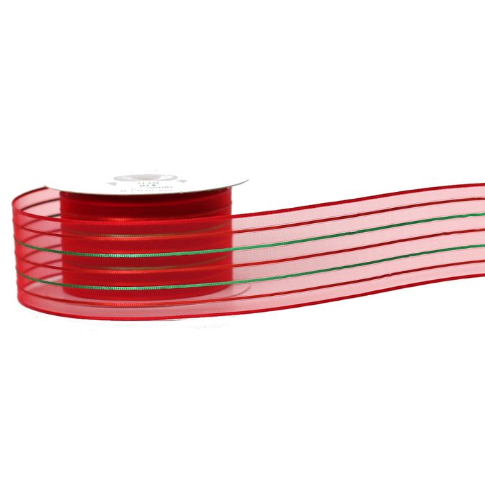 Sheer red wired edge ribbon with elelgant thin stripes of green and red.