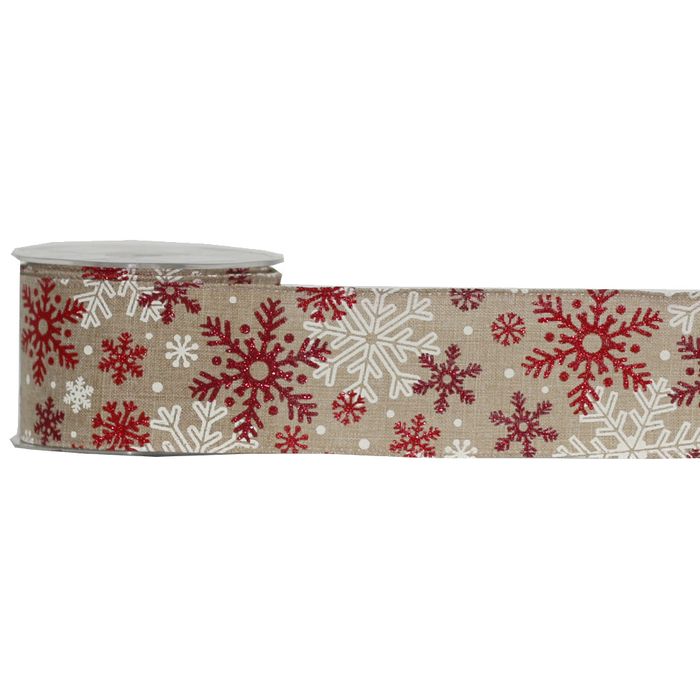 Natural wired ribbon with red sparkly snowflakes and natural white snowflakes.