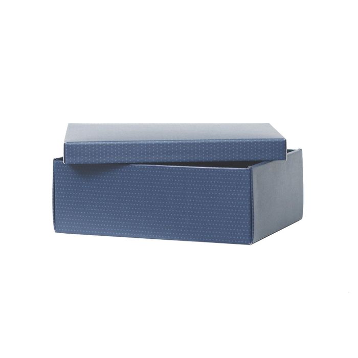 Sturdy European box with seperate lid -comes flat packed. Sophisticated royale blue with slight dot pattern -all three sizes will take a wine bottle .