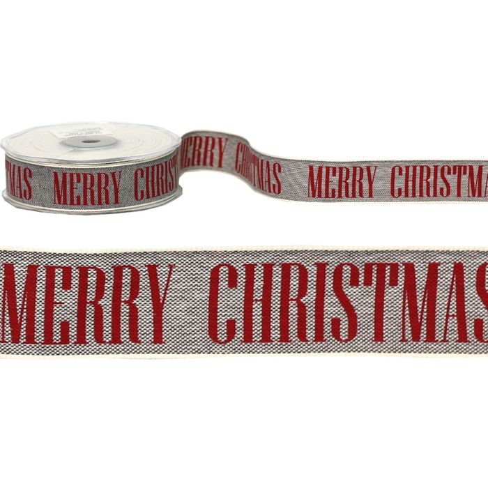 Light greyish/black linen type ribbon with red "Merry Christmas" font.